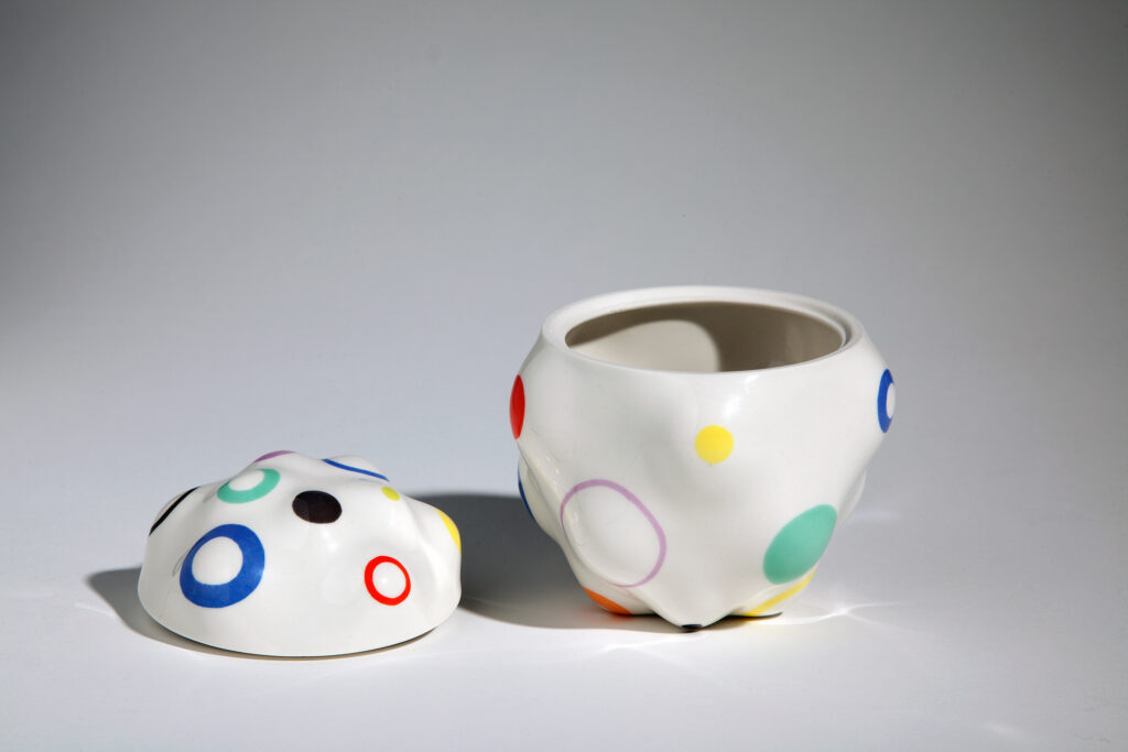 Die Dose ist im Giessverfahrten hergestellt. Das Dekor wird mit Siebdruckschiebebilder auf die Stücke appliziert und bei einer Temperatur von über 1200°C dauerhaft in die Glasur eingebrannt.